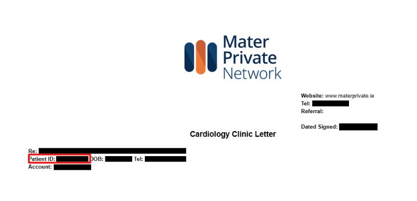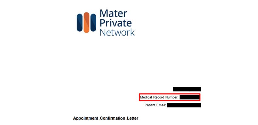 You will need a valid email address and your Mater Private Medical Record Number (MRN) / Hospital number. You can find it at the top of your appointment letters and receipts (see images below). Please make sure our logo is included in the document.